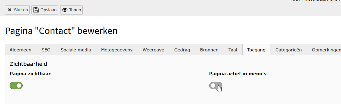 Klik op het tabblad Toegang en zet het schuifje bij Pagina actief in menu's aan.