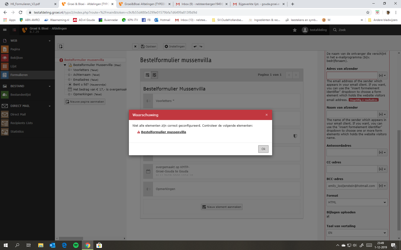Ik volg de handleiding nauwkeurig, vul bij de afzender emailadres en naam in. Dan volgt de foutmelding en wordt finisher niet opgeslagen. Zie de bijlage.