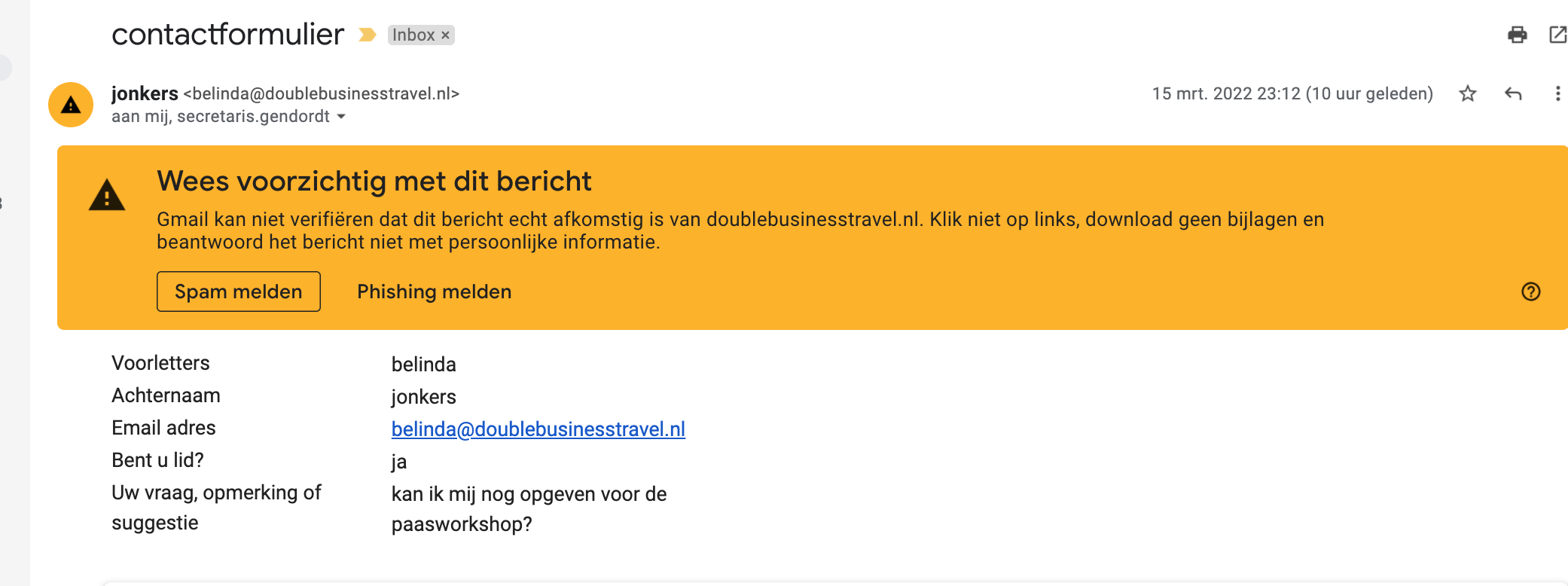 Het e-mail adres van de invuller van het formulier wordt nu gebruikt als afzender van een e-mail die van de website komt. Dat betekent dat als iemand met een @doublebusinesstravel.nl e-mailadres het formulier invult, dan wordt de mail vanaf onze groei.nl website gestuurd, met als afzender @doublebusinesstravel.nl. Die twee matchen niet met elkaar. Hoe kan iemand met een @doublebusinesstravel.nl adres nou een mail sturen vanaf een groei.nl website? Het kan dus zijn dat het spamfilter dan zegt: dat ziet er te verdacht uit, dat zal dan dus wel spam zijn.