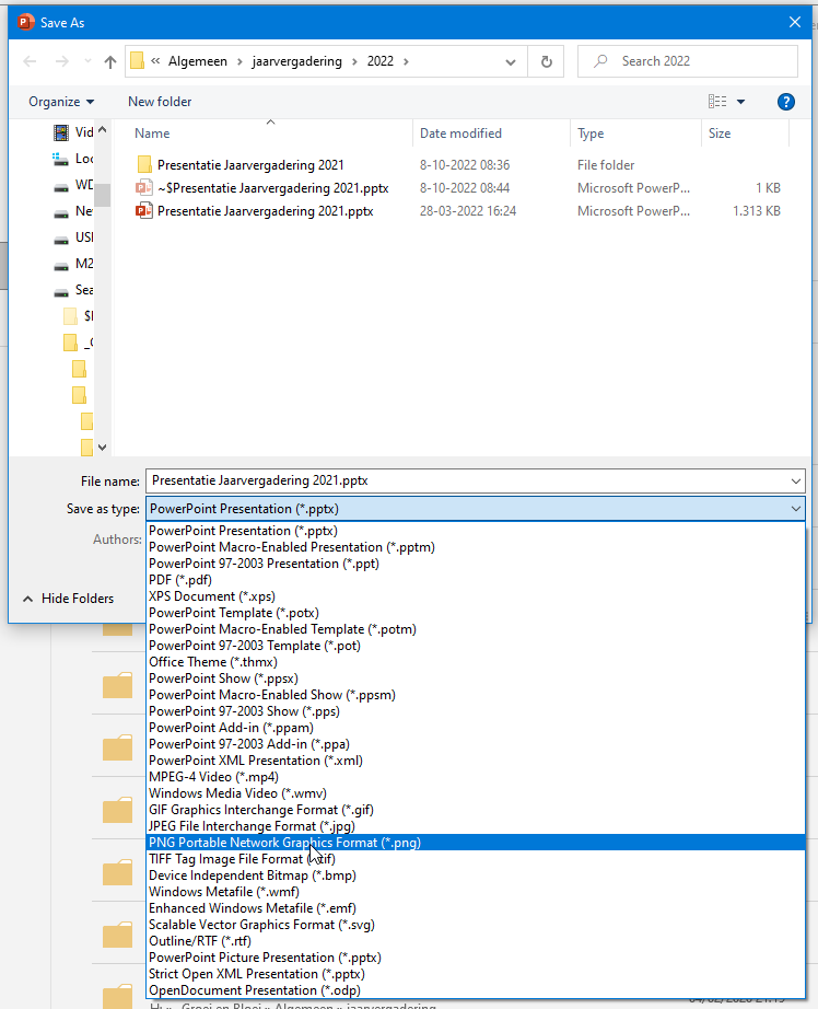 Dat gaat als volgt: Open de presentatie en kies Bestand en dan Bestand Opslaan als. Kies een plekje op je computer, maar voordat je opslaat, kies je onderaan het Opslaan venster voor PNG of JPG.