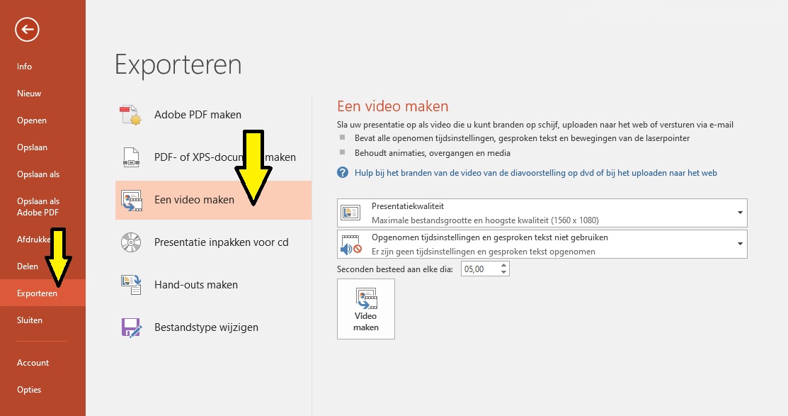 Ik bedacht opeens: je kunt ook heel makkelijk een video maken van je presentatie. Dat zit gewoon in PowerPoint.