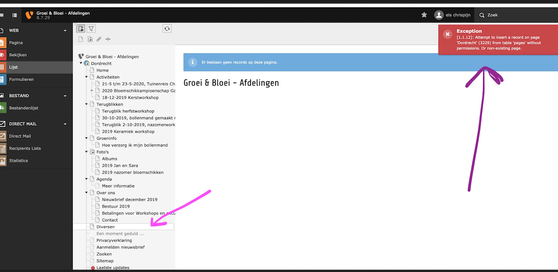 op de pagina Diversen slepen en dan de muis loslaten. Niet onder de pagina, want dat wil ie een pagina op het hoofdniveau maken, en dat mag/kan niet.