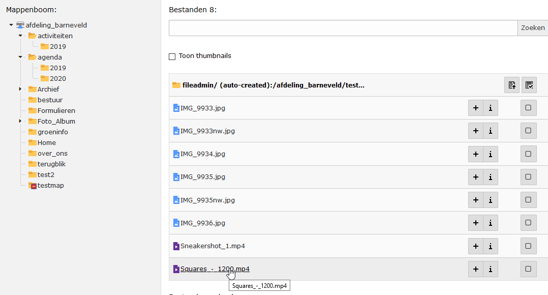 In TYPO3 ga je naar de bestandenlijst en naar de folder waar je je film in wilt zetten. Het uploaden van het filmpje gaat net zo als afbeeldingen uploaden. Dat lijkt me geen probleem te zijn. Het uploaden van en grote film kan even duren, zeker als je geen snelle internet verbinding hebt.