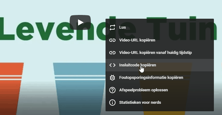 2. Rechtsklik op het YouTube videootje dat je wilt opnemen in de site. Kies Insluitcode kopieeren (Copy embed code).